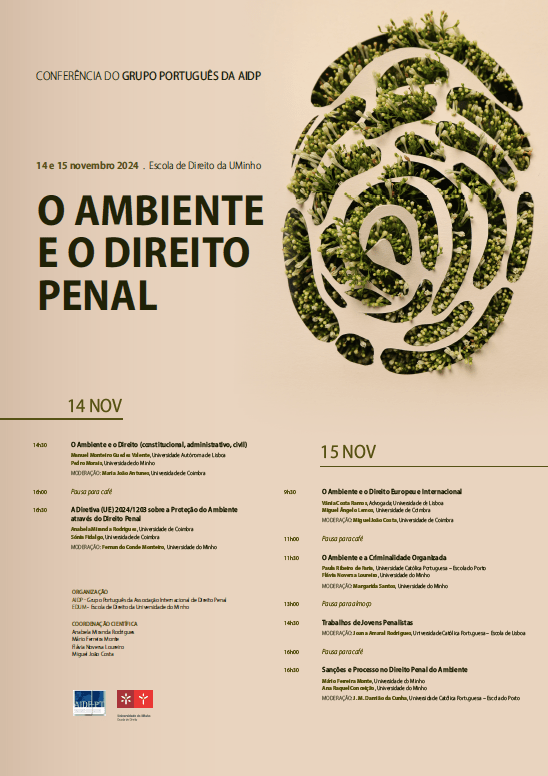Conferência do Grupo Português da AIDP: O Ambiente e o Direito Penal (Universidade do Minho, 14-15 de Novembro de 2024) Escrito por:aidpportugal25 de Julho de 202425 de Julho de 2024Posted inAtividade Gratuita, sujeita a inscrição aqui. Partilhar isto: Click to share on X (Abre numa nova janela) X Clique para partilhar no Facebook (Abre numa nova janela) Facebook Gosto Carregando... Relacionado
